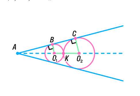 Так как окружности касаются угла, их центры лежат на биссектрисе угла, значит \(\angle CAO_2 = 30^\circ\).