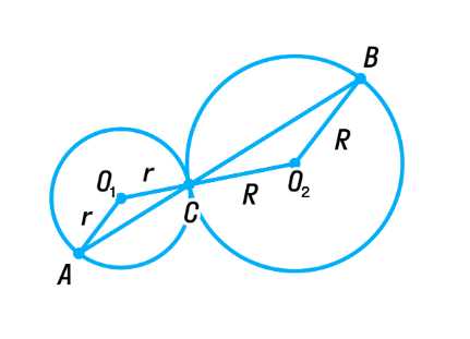 Рассмотрим два треугольника \(AO_1C\) и \(BO_2C\). В каждом из них две стороны равны, так как они являются радиусами соответствующих окружностей: \(AO_1 = O_1C = r\) и \(BO_2 = O_2C = R\). Это означает, что треугольники равнобедренные. Кроме того, углы при вершинах \(O_1\) и \(O_2\) равны, так как они являются вертикальными углами, образованными при пересечении прямых \(AC\) и \(BC\). Следовательно, треугольники \(AO_1C\) и \(BO_2C\) подобны по двум углам.