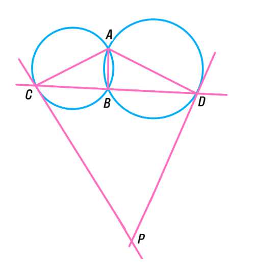 Угол между касательной и хордой, проходящей через точку касания, измеряется как половина дуги, заключённой в этом угле. Это ключевое свойство позволяет связать углы, образованные касательными и хордами, с соответствующими дугами окружностей. В данной задаче у нас есть две окружности, касающиеся в точке \( A \), и касательные к этим окружностям в точках \( C \) и \( D \), которые пересекаются в точке \( P \). Для решения нам нужно найти сумму углов \( \angle DAC \) и \( \angle DPC \).