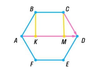 4) Теперь рассмотрим векторы \(\overrightarrow{AD}\) и \(\overrightarrow{CD}\). Вектор \(\overrightarrow{AD}\) соединяет точку A с точкой D, проходя через две стороны шестиугольника. Для нахождения длины отрезка AD нужно сделать дополнительные построения. Отрезок AD можно представить как сумму отрезков \(AK + KM + MD\), где \(AK = \frac{1}{2}\), \(KM = 1\), \(MD = \frac{1}{2}\), что даёт \(AD = 2\).