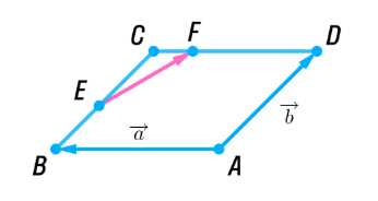 Теперь нам нужно выразить вектор \( \overrightarrow{EF} \) через вектора \( \vec{a} \) и \( \vec{b} \). По правилу сложения векторов \( \overrightarrow{EF} = \overrightarrow{EC} + \overrightarrow{CF} \). Подставим выражения для \( \overrightarrow{EC} \) и \( \overrightarrow{CF} \):