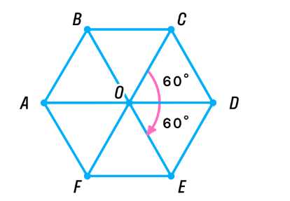 Правильный шестиугольник — это многоугольник с шестью равными сторонами и равными углами. Он вписан в окружность, и центр этой окружности совпадает с центром многоугольника. Поскольку окружность равна \( 360^\circ \), а правильный шестиугольник делит её на 6 равных частей, каждый центральный угол, образованный соседними вершинами, равен \( \frac{360^\circ}{6} = 60^\circ \). Таким образом, углы \( \angle COD \), \( \angle DOE \), \( \angle EOF \), \( \angle FOA \), \( \angle AOB \), \( \angle BOC \) все равны \( 60^\circ \).
