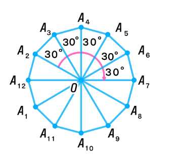 Правильный двенадцатиугольник равномерно делит окружность на 12 равных частей, так как у него 12 вершин и все стороны равны. Поскольку полная окружность равна \(360^\circ\), каждый центральный угол, образуемый радиусами, проведёнными к соседним вершинам, равен \( \frac{360^\circ}{12} = 30^\circ \). Это означает, что угол между точками \(A_i\) и \(A_{i+1}\) при центре \(O\) составляет ровно 30 градусов для всех \(i\).