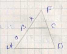 Далее, по свойству подобных треугольников \( \triangle AFD \) и \( \triangle BFC \), которые получаются при пересечении продолжений боковых сторон, можно записать пропорцию: \( \frac{BF}{AF} = \frac{BC}{AD} \). Подставим известные значения: \( \frac{7}{10} = \frac{x-6}{x} \). Это уравнение связывает длины оснований трапеции с отношением отрезков, на которые точка \( F \) делит продолжение боковой стороны.
