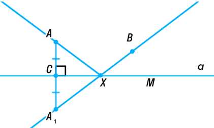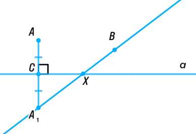 Теперь рассмотрим длину отрезка \( A_1 B \). По построению, это кратчайшее расстояние между точками \( A_1 \) и \( B \). Отрезок \( A_1 B \) можно представить как сумму отрезков \( A_1 X \) и \( X B \), то есть \( A_1 B = A_1 X + X B \). Подставляя равенство \( A X = A_1 X \), получаем \( A_1 B = A X + X B \). Поскольку \( A_1 B \) — минимальное расстояние между точками \( A_1 \) и \( B \), сумма \( A X + X B \) также минимальна. Это и доказывает, что точка \( X \) — искомая точка, при которой сумма расстояний от \( A \) и \( B \) до прямой \( a \) минимальна.