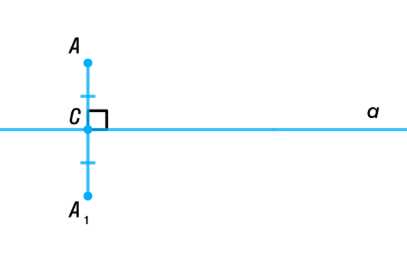 Рассмотрим точку \( A \) и прямую \( a \). Построим точку \( A_1 \) как образ точки \( A \) при симметрии относительно прямой \( a \). Это значит, что прямая \( a \) является серединным перпендикуляром отрезка \( A A_1 \), то есть она делит этот отрезок пополам и при этом перпендикулярна ему. Следовательно, точка \( C \), в которой прямая \( a \) пересекает отрезок \( A A_1 \), является серединой этого отрезка, и выполняется равенство \( AC = CA_1 \), а углы при точке пересечения прямых \( A C \) и \( a \) прямые.