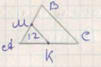 Точка М — середина стороны АВ треугольника АВС, точка К — середина стороны АС. Площадь треугольника АМК равна 12 см². Чему равна площадь четырёхугольника ВМКС?