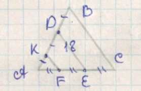 Площадь треугольника АВС равна 18 см². На стороне АВ отметили точки К и D так, что АК = KD = DB, а на стороне АС — точки F и Е так, что AF = FE = ЕС. Найдите площадь четырёхугольника DEFK.