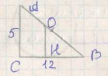 Для нахождения радиуса окружности, которая касается катета и проходит через вершину противолежащего угла, используется формула: \( R = \frac{a^{2} + b^{2} — ab}{2(a + b)} \), где \( a \) и \( b \) — катеты треугольника. Подставим значения: \( R = \frac{5^{2} + 12^{2} — 5 \cdot 12}{2 \cdot (5 + 12)} = \frac{25 + 144 — 60}{2 \cdot 17} = \frac{109}{34} \).