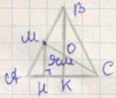 Чтобы найти расстояние от точки пересечения медиан до основания, нужно определить, какая часть медианы \(МН\) лежит между центроидом и основанием. Центроид делит медиану так, что от вершины до центроида расстояние равно \(\frac{2}{3}\) всей медианы, а от центроида до основания — \(\frac{1}{3}\) всей медианы. В данном случае нас интересует расстояние от центроида до основания, но по фото видно, что вопрос стоит о расстоянии от основания до точки пересечения медиан, то есть \(ОК = \frac{2}{3} \cdot МН\).
