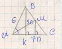 В треугольнике \(ABC\) известно, что \(BK = 26\) см — это высота, а \(AM\) — биссектриса. По условию задачи стороны \(AB\) и \(AC\) относятся как \(6:7\), то есть пусть \(AB = 6x\) и \(AC = 7x\). Биссектриса \(AM\) по теореме о биссектрисе делит сторону \(BC\) в отношении \(AB : AC\), то есть точка \(M\) делит \(BC\) так, что \(BM : MC = AB : AC = 6:7\). Важно заметить, что точка \(M\) лежит на стороне \(BC\), и из неё опускается перпендикуляр \(MD\) на сторону \(AC\).