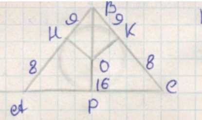 Полупериметр треугольника равен \(p = \frac{a + 2b}{2} = \frac{8x + 2 \cdot 17x}{2} = \frac{8x + 34x}{2} = \frac{42x}{2} = 21x\). Радиус вписанной окружности по условию задачи равен \(r = 16\). Площадь треугольника выражается через радиус и полупериметр формулой \(S = r \cdot p\), то есть \(S = 16 \cdot 21x = 336x\).