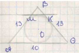 В треугольнике АВС известно, что АВ = ВС = 13 см, АС = 10 см. К окружности, вписанной в этот треугольник, проведена касательная, которая параллельна основанию АС и пересекает стороны АВ и ВС в точках М и К соответственно. Вычислите площадь треугольника МВК.