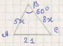 Пусть стороны \(AB = 5x\), \(BC = 8x\), угол между ними \(60^\circ\), а третья сторона \(AC = 21\).