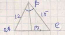 Рассмотрим треугольник, в котором стороны \(AB\), \(AC\) и \(BC\) равны 12 см, 15 см и 18 см соответственно. Пусть биссектриса проведена из вершины \(A\) к стороне \(BC\), и она делит эту сторону на отрезки \(BE\) и \(EC\). Обозначим \(BE = x\), а \(EC = 18 — x\). Согласно теореме о биссектрисе, отношение частей стороны, на которые биссектриса делит сторону, равно отношению прилежащих сторон: \(\frac{AB}{AC} = \frac{BE}{EC}\).