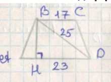 Найдите высоту равнобокой трапеции, основания которой равны 23 см и 17 см, а диагональ — 25 см.