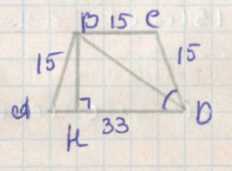 Для начала рассмотрим равнобокую трапецию с основаниями 15 см и 33 см. Из условия известно, что диагональ делит острый угол пополам. Это значит, что высота трапеции может быть найдена через разность оснований, поделённую на 2. Высота \( AH \) равна половине разности длин оснований, то есть \( AH = \frac{33 — 15}{2} \). Вычисляем: \( \frac{18}{2} = 9 \) см. Эта высота — перпендикуляр, опущенный из вершины трапеции на основание.