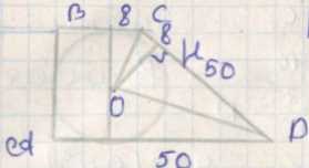 В прямоугольной трапеции окружность касается большей боковой стороны, разделяя её на два отрезка длиной 8 см и 50 см. Для начала определим длину меньшей боковой стороны, обозначенной как \( OU \). Так как трапеция прямоугольная, то \( OU \) является гипотенузой прямоугольного треугольника с катетами 8 см и 50 см. Применяем теорему Пифагора: \( OU = \sqrt{8^2 + 50^2} \). Вычисляем степени: \( 8^2 = 64 \) и \( 50^2 = 2500 \), затем складываем: \( 64 + 2500 = 2564 \). Извлекаем квадратный корень: \( OU = \sqrt{2564} = 20 \) см.