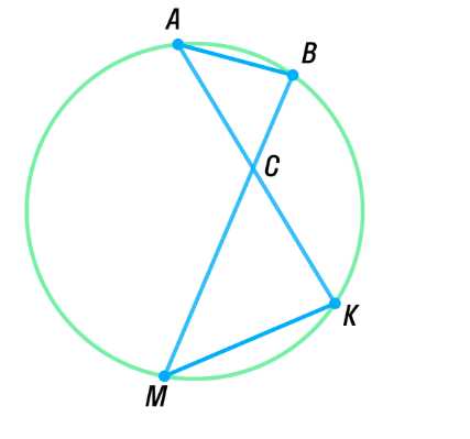 Рассмотрим треугольники \( ABC \) и \( MKC \), которые лежат на окружности. Чтобы доказать их подобие, нужно показать равенство трёх пар соответствующих углов. Первый угол \( \angle ABC \) равен углу \( \angle CKM \), так как они опираются на одну и ту же дугу окружности. Аналогично, угол \( \angle BAC \) равен углу \( \angle CMK \) по той же причине — они тоже опираются на одну и ту же дугу. Третий угол \( \angle MCK \) равен углу \( \angle ACB \), так как эти углы являются вертикальными, то есть образованы пересечением двух прямых и равны по определению.
