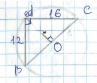 Теперь найдем длину стороны \(BC\). Поскольку хорды \(AB\) и \(AC\) перпендикулярны, треугольник \(ABC\) прямоугольный, и длина \(BC\) может быть найдена по теореме Пифагора: \(BC = \sqrt{AB^2 + AC^2} = \sqrt{12^2 + 16^2} = \sqrt{144 + 256} = \sqrt{400} = 20\) см. Площадь треугольника \(ABC\) вычисляется как \(\frac{1}{2} \times AB \times AC = \frac{1}{2} \times 12 \times 16 = 96\). Эта площадь также может быть выражена через высоту \(h\), опущенную из точки \(A\) на сторону \(BC\): \(\frac{1}{2} \times BC \times h = 96\). Подставляя \(BC = 20\), получаем \(h = \frac{192}{20} = 9.6\) см.