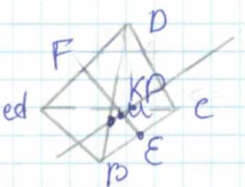 Точки \(M\), \(K\), \(P\) делят отрезки \(BD\), \(EF\), \(AC\) в отношении \(2:1\). Значит, точка \(M\) на отрезке \(BD\) делит его так, что \(DM : MB = 2 : 1\). По формуле деления отрезка внутрь векторная координата точки \(M\) будет \(\vec{M} = \frac{2\vec{B} + \vec{D}}{3}\). Аналогично, точка \(K\) делит отрезок \(EF\) в отношении \(2:1\) с \(FK : KE = 2 : 1\), следовательно \(\vec{K} = \frac{2\vec{E} + \vec{F}}{3}\). Подставляя выражения для \(\vec{E}\) и \(\vec{F}\), получаем \(\vec{K} = \frac{2\frac{\vec{B} + \vec{C}}{2} + \frac{\vec{A} + \vec{D}}{2}}{3} = \frac{2\vec{B} + 2\vec{C} + \vec{A} + \vec{D}}{6}\). Точка \(P\) на отрезке \(AC\) делит его так, что \(AP : PC = 2 : 1\), значит \(\vec{P} = \frac{2\vec{C} + \vec{A}}{3}\).