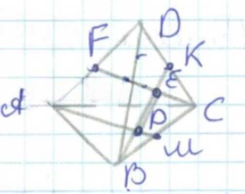 Точка \(E\) лежит на отрезке \(CF\) и делит его в отношении \(2:3\), где \(F\) — середина ребра \(AD\), то есть \(F = \frac{A + D}{2}\). По формуле деления отрезка в заданном отношении, координаты точки \(E\) равны \(E = C + \frac{2}{5}(F — C)\). Подставляя \(F\), получаем \(E = C + \frac{2}{5}\left(\frac{A + D}{2} — C\right) = \frac{1}{5}A + \frac{3}{5}C + \frac{1}{5}D\). Таким образом, точка \(E\) также выражается через вершины тетраэдра с определёнными коэффициентами, отражающими её положение на отрезке \(CF\).