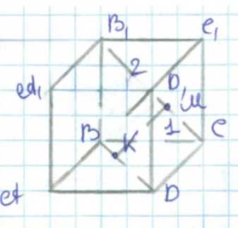 Рассмотрим куб с ребром длины \(a\) и координатами вершин: \(A(0,0,0)\), \(B(a,0,0)\), \(C(a,a,0)\), \(D(0,a,0)\), \(A_1(0,0,a)\), \(B_1(a,0,a)\), \(C_1(a,a,a)\), \(D_1(0,a,a)\). Точки \(M\) и \(K\) лежат на отрезках \(B_1C\) и \(BD\) соответственно. По условию \(B_1M : MC = 2 : 1\), значит точка \(M\) делит отрезок \(B_1C\) в отношении 2 к 1, считая от \(B_1\). Используем формулу деления отрезка в отношении \(m:n\): координата точки \(M\) равна \(\frac{m \cdot C + n \cdot B_1}{m+n}\). Подставляя значения, получаем \(M = \frac{2 \cdot (a,a,0) + 1 \cdot (a,0,a)}{3} = \left(a, \frac{2a}{3}, \frac{a}{3}\right)\).