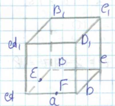 Для удобства вычислений зададим координаты вершин куба с ребром \(a\) в трехмерном пространстве. Пусть вершина \(A\) находится в начале координат, тогда \(A = (0,0,0)\). Ребро \(AB\) расположено вдоль оси \(x\), значит \(B = (a,0,0)\). Ребро \(AD\) расположено вдоль оси \(y\), значит \(D = (0,a,0)\). Верхняя грань куба параллельна нижней, поэтому \(A_1 = (0,0,a)\), \(B_1 = (a,0,a)\), \(C_1 = (a,a,a)\), \(D_1 = (0,a,a)\). Точки \(E\) и \(F\) — середины рёбер \(AB\) и \(AD\), соответственно, значит \(E = \left(\frac{a}{2},0,0\right)\), \(F = \left(0,\frac{a}{2},0\right)\).