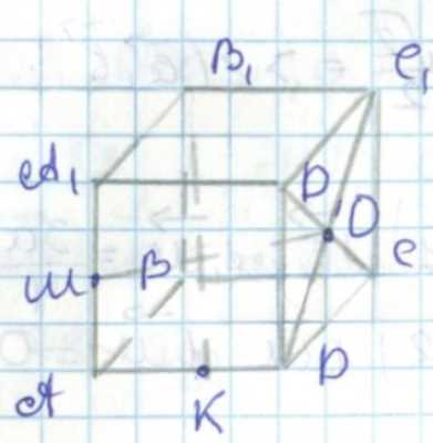 2. Теперь найдём векторы \( \overrightarrow{BK} \) и \( \overrightarrow{MO} \). Вектор \( \overrightarrow{BK} \) направлен от точки \( B \) к точке \( K \), поэтому \( \overrightarrow{BK} = K — B = \frac{A + D}{2} — B \). Вектор \( \overrightarrow{MO} \) направлен от точки \( M \) к точке \( O \), значит \( \overrightarrow{MO} = O — M = \frac{C + C_1 + D_1 + D}{4} — \frac{A + A_1}{2} \). Для удобства можно представить координаты всех точек через базисные векторы куба, например, пусть \( A = (0,0,0) \), \( B = (a,0,0) \), \( D = (0,a,0) \), \( A_1 = (0,0,a) \) и так далее.