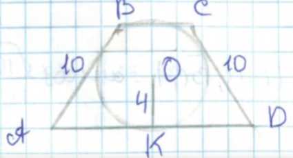 Дано равнобокая трапеция с боковыми сторонами по 10 см и радиусом вписанной окружности 4 см. Сумма оснований равна сумме боковых сторон, то есть \(BC + AD = AB + CD = 20\) см.