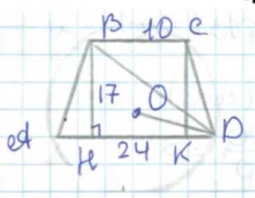 Основания равнобокой трапеции равны 10 см и 24 см, а высота — 17 см. Найдите радиус окружности, описанной около трапеции.