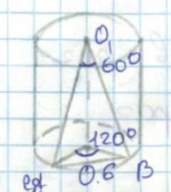 Рассмотрим теперь, как эта же хорда видна из центра верхнего основания \(O_{1}\) под углом \(60^\circ\). Соединим точки \(O\) и \(O_{1}\), высота цилиндра \(h = OO_{1}\). Треугольник \(AO_{1}B\) — равнобедренный, так как \(O_{1}A = O_{1}B\), а угол при вершине \(O_{1}\) равен \(60^\circ\). В этом треугольнике применим определение синуса: \(\sin 60^\circ = \frac{AB}{AO_{1}B}\), но проще использовать тангенс половины угла, так как из центра основания угол \(120^\circ\), а из центра верхнего основания — \(60^\circ\), и ось цилиндра перпендикулярна основанию. По построению, расстояние между центрами оснований равно высоте цилиндра. Тогда \(\tan 30^\circ = \frac{AB}{h}\), так как проекция хорды на плоскость, перпендикулярную оси цилиндра, видна под углом \(30^\circ\) к оси (половина разности углов обзора). Получаем: \(\tan 30^\circ = \frac{6}{h}\), отсюда \(\frac{\sqrt{3}}{3} = \frac{6}{h}\), тогда \(h = 6 \cdot \frac{3}{\sqrt{3}} = 6\sqrt{3}/\sqrt{3} = 6\) см.