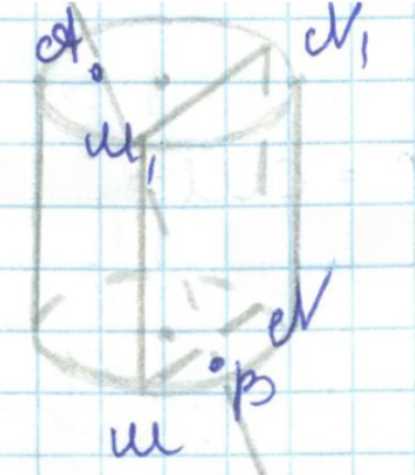Для нахождения точки пересечения прямой \(AB\) с плоскостью \(MM_1N_1N\) сначала нужно построить само сечение цилиндра. Плоскость \(MM_1N_1N\) проходит через две точки на верхнем основании цилиндра (\(M\) и \(N\)), а также через две соответствующие им точки на нижнем основании (\(M_1\) и \(N_1\)). Это сечение параллельно оси цилиндра, то есть его прямая пересекает основания по отрезкам, соединяющим \(M\) с \(M_1\) и \(N\) с \(N_1\).