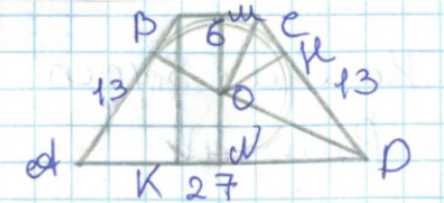 Для вычисления радиуса вписанной окружности используем известную формулу для равнобокой трапеции: радиус равен половине высоты, проведённой из вершины на основание. Таким образом, \(OH = \frac{1}{2} DK = \frac{1}{2} \sqrt{58{,}75} = 6\). Ответ: \(6\,\text{см}\).