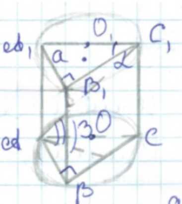 Основание призмы — прямоугольный треугольник, где один из катетов равен \(a\), а угол при этом катете — \(\alpha\). По определению синуса, гипотенуза этого треугольника выражается как \(c = \frac{a}{\sin\alpha}\). Это значение важно, потому что цилиндр описан вокруг призмы так, что его диаметр совпадает с длиной гипотенузы основания. Следовательно, радиус описанного цилиндра равен половине гипотенузы: \(r = \frac{c}{2} = \frac{a}{2\sin\alpha}\).