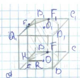 В правильной четырехугольной призме основание — квадрат, а цилиндр вписан так, что его ось параллельна боковым рёбрам. Радиус основания цилиндра равен \(R\), и он касается двух соседних боковых граней призмы. Квадрат \(EE_1F_1F\) образован точками касания цилиндра с этими гранями, причём его стороны — это хорды, параллельные боковым рёбрам, и расстояние между ними совпадает с диаметром основания цилиндра.