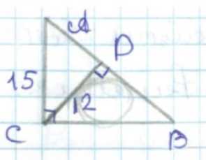В прямоугольном треугольнике \(ACB\) известны катет \(AC = 15\) см и высота \(CD = 12\) см, проведённая к гипотенузе \(AB\). Чтобы найти стороны треугольника \(BCD\), сначала определим длину отрезка \(AD\), который является проекцией катета \(AC\) на гипотенузу. По теореме Пифагора: \(AD = \sqrt{AC^{2} — CD^{2}} = \sqrt{15^{2} — 12^{2}} = \sqrt{225 — 144} = \sqrt{81} = 9\) см.