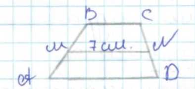 Средняя линия трапеции вычисляется по формуле: \( \frac{BC + AD}{2} \). Подставляя значение средней линии, получаем \( \frac{BC + AD}{2} = 7 \), откуда следует, что \( BC + AD = 2 \times 7 = 14 \) см. Таким образом, сумма боковых сторон трапеции составляет 14 см.