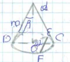 Пусть \(EF\) — хорда, стягивающая дугу с центральным углом \(\alpha\). По формуле длины хорды в окружности, если радиус \(r\) и угол \(\alpha\), длина хорды вычисляется как \(EF = 2r \sin \frac{\alpha}{2}\). Подставим найденный радиус: \(EF = 2 t \sin \beta \sin \frac{\alpha}{2}\). Это выражение учитывает, что хорда зависит от радиуса основания и угла, который она стягивает.