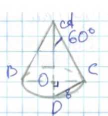 Для определения длины образующей конуса используем теорему косинусов. В основании конуса точки \( C \) и \( D \) равноудалены от центра \( O \), \( OC = OD = r \), угол между ними равен \( 60^\circ \), так как угол между образующими конуса по условию задачи \( 60^\circ \). Применяем теорему косинусов: \( CD^{2} = OC^{2} + OD^{2} — 2 \cdot OC \cdot OD \cdot \cos 60^\circ \). Подставляем: \( 8^{2} = l^{2} + l^{2} — 2l^{2} \cdot \frac{1}{2} \). Получаем: \( 64 = 2l^{2} — l^{2} = l^{2} \), значит \( l = 8 \) см.