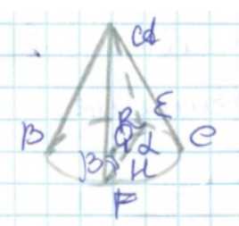 Высота \(d\) сечения связана с углом \(\alpha\) между плоскостью сечения и плоскостью основания конуса. При этом угол \(\beta\) — это угол между образующей и плоскостью основания. Радиус основания конуса равен \(R\). Из геометрических соотношений для конуса и заданных углов можно выразить длину \(FE\) и высоту \(d\) через \(R\), \(\alpha\) и \(\beta\). В частности, основание \(FE\) и высота \(d\) связаны с тангенсами этих углов.