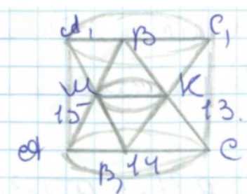 Средняя линия \(MK\) треугольника \(ABC\) параллельна стороне \(AC\) и равна половине её длины, поэтому \(MK = \frac{14}{2} = 7\) см. Это важно, так как ось вращения проходит именно через эту среднюю линию, и длина \(MK\) будет радиусом вращения для точек треугольника, расположенных на стороне \(AC\).