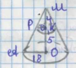 1. Пусть \(MO\) — высота конуса, \(O\) — центр основания, \(M\) — вершина. Радиус основания конуса \(R = 18\) см. На \(MO\) выбрана точка \(K\) так, что \(MK : KO = 4 : 5\). Значит, вся высота \(MO\) делится на части \(MK\) и \(KO\), причём \(MK = \frac{4}{4+5} \times MO = \frac{4}{9} MO\), а \(KO = \frac{5}{9} MO\).