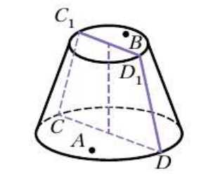 1. Рассмотрим усечённый конус, у которого осевое сечение — четырёхугольник \(CC_1D_1D\), проходящий через ось конуса. Точки \(A\) и \(B\) выбраны на разных основаниях конуса, причём они лежат по разные стороны от осевого сечения. Прямая \(AB\) соединяет эти точки и проходит через внутреннюю часть конуса, пересекает плоскость осевого сечения. Плоскость \(CC_1D_1\) — это часть осевого сечения, проходящая через точки верхнего и нижнего основания.