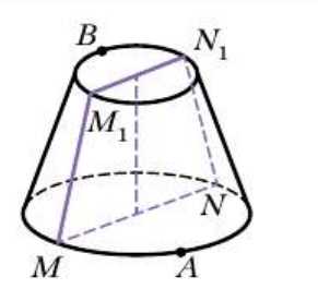 В усечённом конусе проведено осевое сечение \(MM_1N_1N\) и по разные стороны от него на окружностях оснований выбраны точки \(A\) и \(B\) (рис. 10.11).