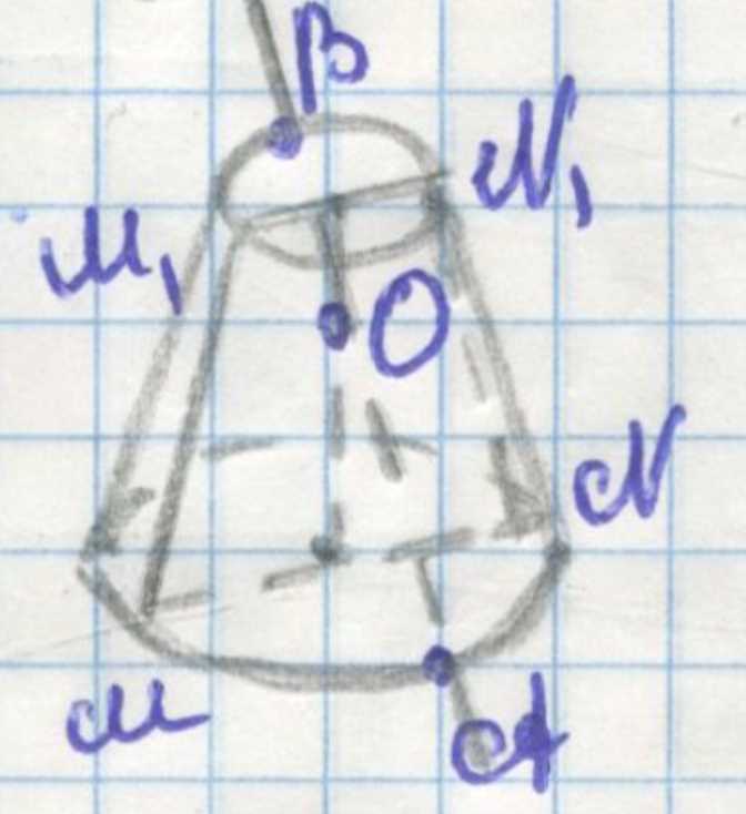 1. Пусть усечённый конус пересечён осевым сечением \(MM_1N_1N\), где точки \(M\) и \(M_1\) лежат на верхнем основании, а \(N\) и \(N_1\) — на нижнем основании. На окружностях оснований выбраны точки \(A\) и \(B\) так, что они расположены по разные стороны от осевого сечения. Прямая \(AB\) проходит через внутренность усечённого конуса, и задача — найти точку её пересечения с плоскостью \(MM_1N_1N\).