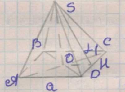 1. Пусть основание пирамиды — квадрат \(ABCD\) со стороной \(a\), а вершина пирамиды — точка \(S\). Радиус основания конуса, описанного около пирамиды, равен половине стороны квадрата, то есть \( r = \frac{a}{2} \). Это связано с тем, что вписанный круг в квадрат касается всех сторон, а его радиус — половина стороны квадрата.