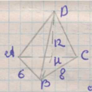 В основании пирамиды лежит прямоугольный треугольник с катетами 6 см и 8 см. Чтобы найти гипотенузу этого треугольника, используем теорему Пифагора: длина гипотенузы равна \( \sqrt{6^{2} + 8^{2}} \). Вычисляем: \( 6^{2} = 36 \), \( 8^{2} = 64 \), значит, \( \sqrt{36 + 64} = \sqrt{100} = 10 \) см.