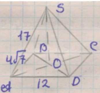 Диагональ основания: \(d = \sqrt{(4\sqrt{7})^2 + 12^2} = \sqrt{112 + 144} = \sqrt{256} = 16\).