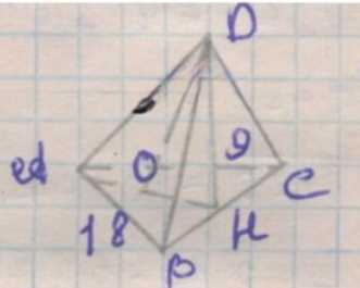Высота пирамиды: \( DH = \sqrt{9^2 — (3\sqrt{3})^2} = \sqrt{81 — 27} = \sqrt{54} = 3\sqrt{6} \) см.